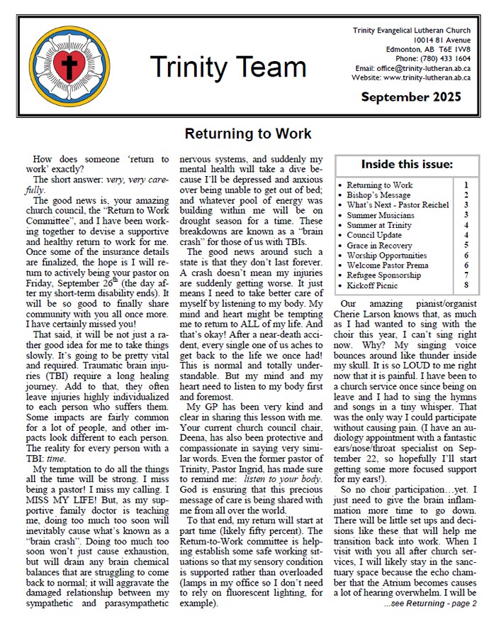 Trinity has many different volunteer committees and groups that through their work serve, support, nurture, and grow our congregation community in various ways. This is a wonderful time of year to explore the diverse opportunities available and get involved in great ways to connect with your church community. For further information, feel welcome to contact the church office.