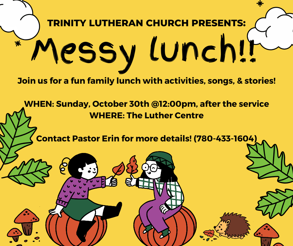 CALLING ALL FAMILIES with YOUNG KIDS!!! Trinity is going to be hosting “Messy Lunch Picnics” once a month this fall. This program is geared towards young families and aimed at helping kids 12 and under engage in Bible lessons. Food and a program will be provided! The first date is Sunday, October 30th after the service. Please RSVP to the office with the number of people in your family and any dietary considerations by Wednesday, October 26th.